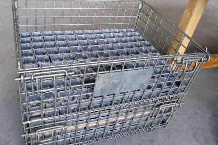 鐵絲籠的主要原材料是高線(xiàn)拉成的鋼絲,一般絲徑是5mm,6mm,6.4mm。網(wǎng)片焊接的網(wǎng)目間距一般為50×100,100×100,50×50。倉(cāng)儲(chǔ)籠底部采用U型鋼焊接而成,U型鋼是冷軋帶鋼軋機(jī)軋制而成,底部四角采用沖壓件一次沖制而成。鐵絲籠采用Q195高線(xiàn)作為原材料,經(jīng)冷拔成型材。再通過(guò)碰焊形成半成品網(wǎng)片。在制作成網(wǎng)片后,可采用鍍鋅或噴塑進(jìn)行表面處理(鐵絲籠大多數(shù)采用鍍鋅處理),表面處理完畢后就可以進(jìn)行組裝,即可制作成成品。